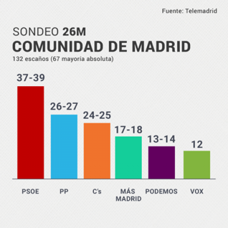 El PSOE ganaría las elecciones autonómicas de la Comunidad de Madrid con el 27,5% de los votos y obtendría entre 37 y 39 escaños, según el sondeo a pie de urna de Sigma Dos para Telemadrid. El candidato socialista, Ángel Gabilondo, podría arrebatarle así el gobierno autonómico al PP después de 24 años con el apoyo de Más Madrid y Unidas Podemos.