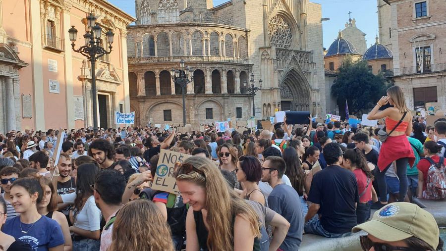 Además de en Barcelona y Madrid, la huelga climática se ha extendido por otros rincones de la geografía española. En Valencia, miles de manifestantes han marchado desde la plaza de la Virgen hasta la plaza del Ayuntamiento.