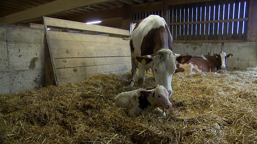 Vaca con ternero recién nacido en establo tveUna vida agradable y sana para los animales, frente a una vida de