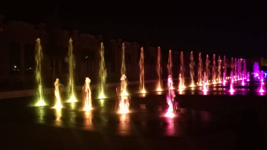La gran lámina de agua del Parque Central situada junto a la nave principal registró anoche las primeras pruebas de agua y juegos de luces. La espectacular fuente con forma de media luna se completará con la siguiente fase del gran jardín.