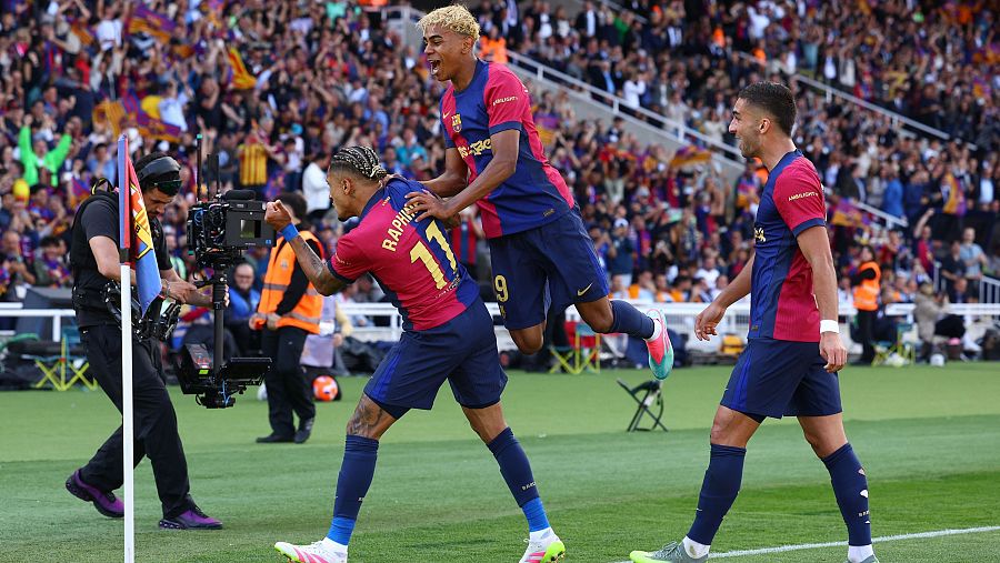 Pasada la media hora, el dúo dinámico -Lamine & Raphinha- se encargó en apenas dos minutos de dar la vuelta al partido. El dorsal '19' del Barcelona se perfiló el balón en su pierna izquierda y se sacó su tiro marca de la casa. Una rosca infinita al segundo palo que se va alejando poco a poco del portero hasta que acaba en el fondo de la red, (2-2, min. 32).